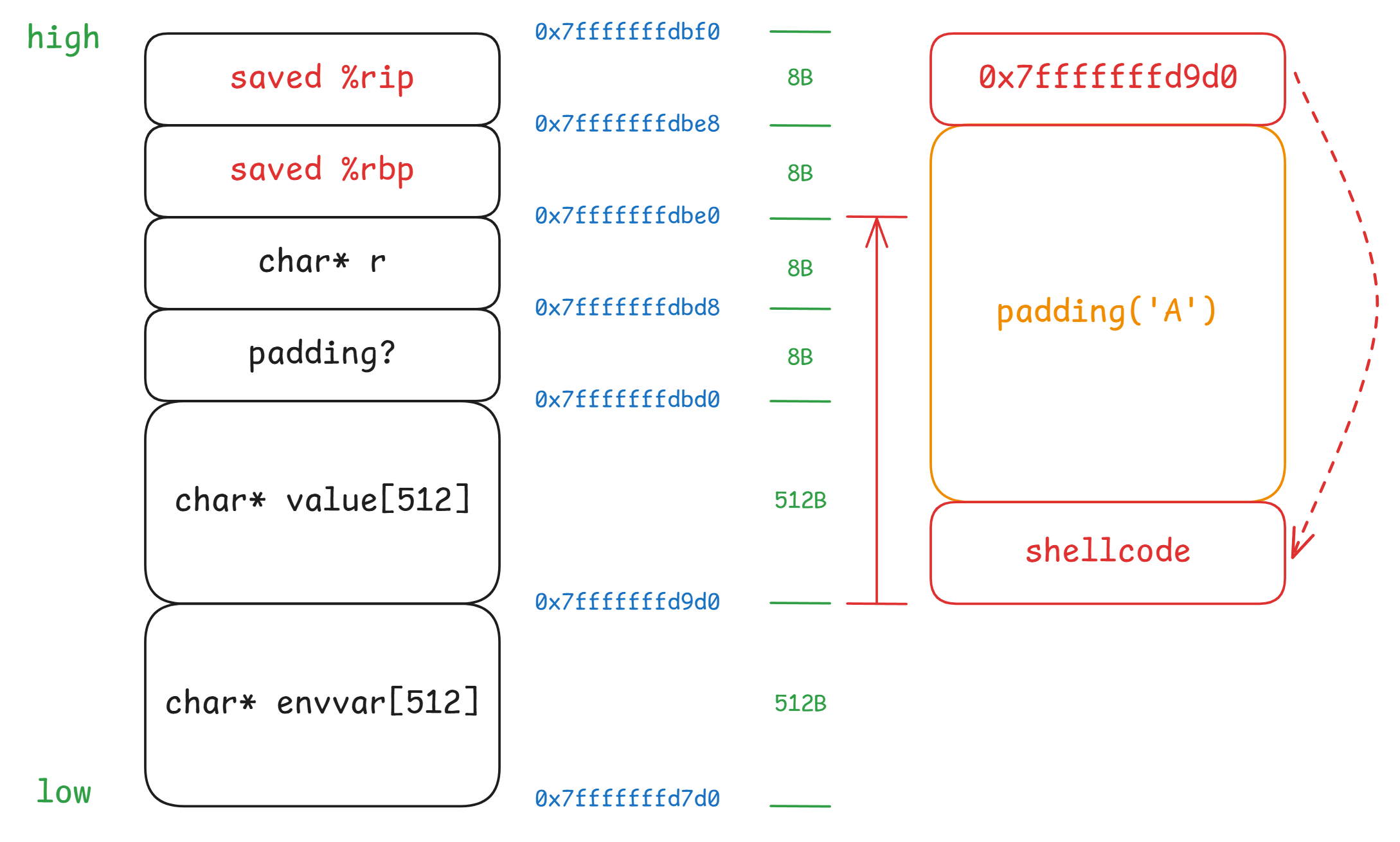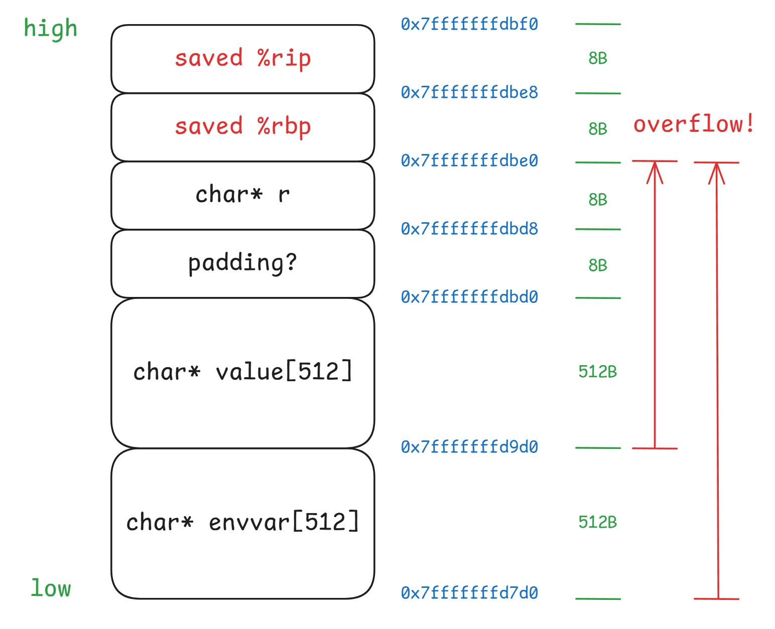 局部变量包含一个 char *r,该变量在栈上的赋值晚于 value/envvar,所以制造栈溢出时需要保证 r 对应的 8B 空间不能用于存放重要数据!