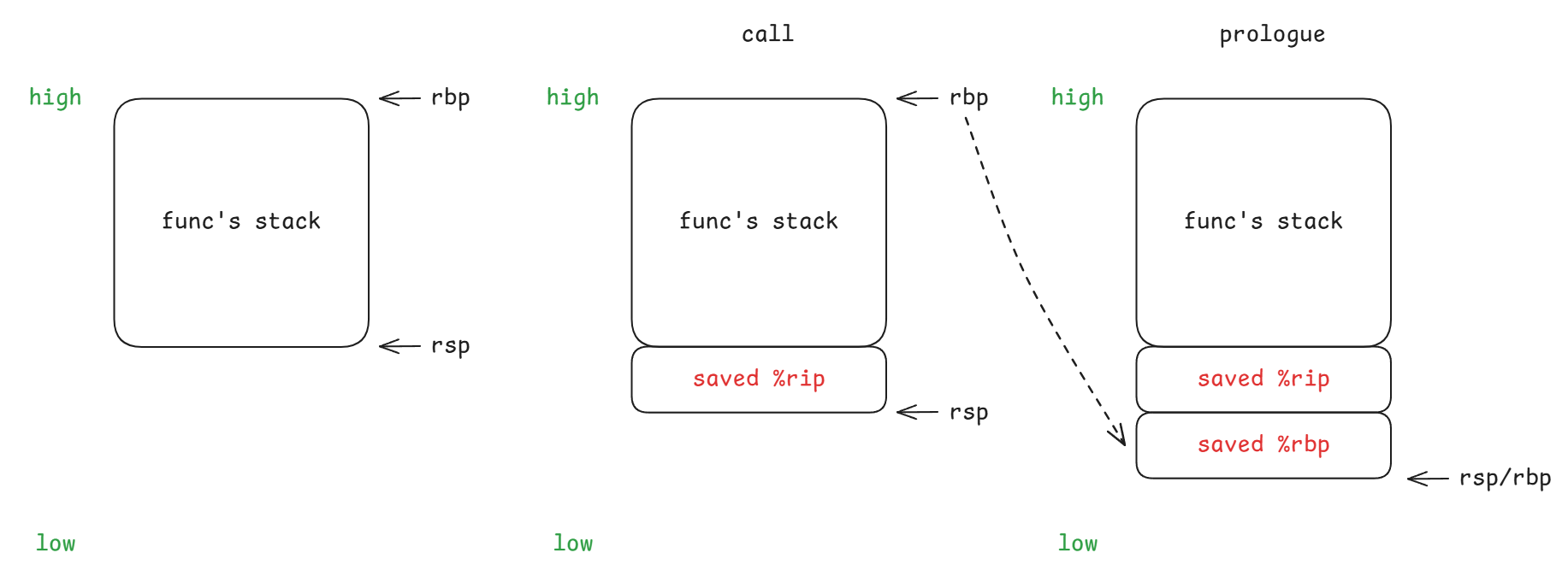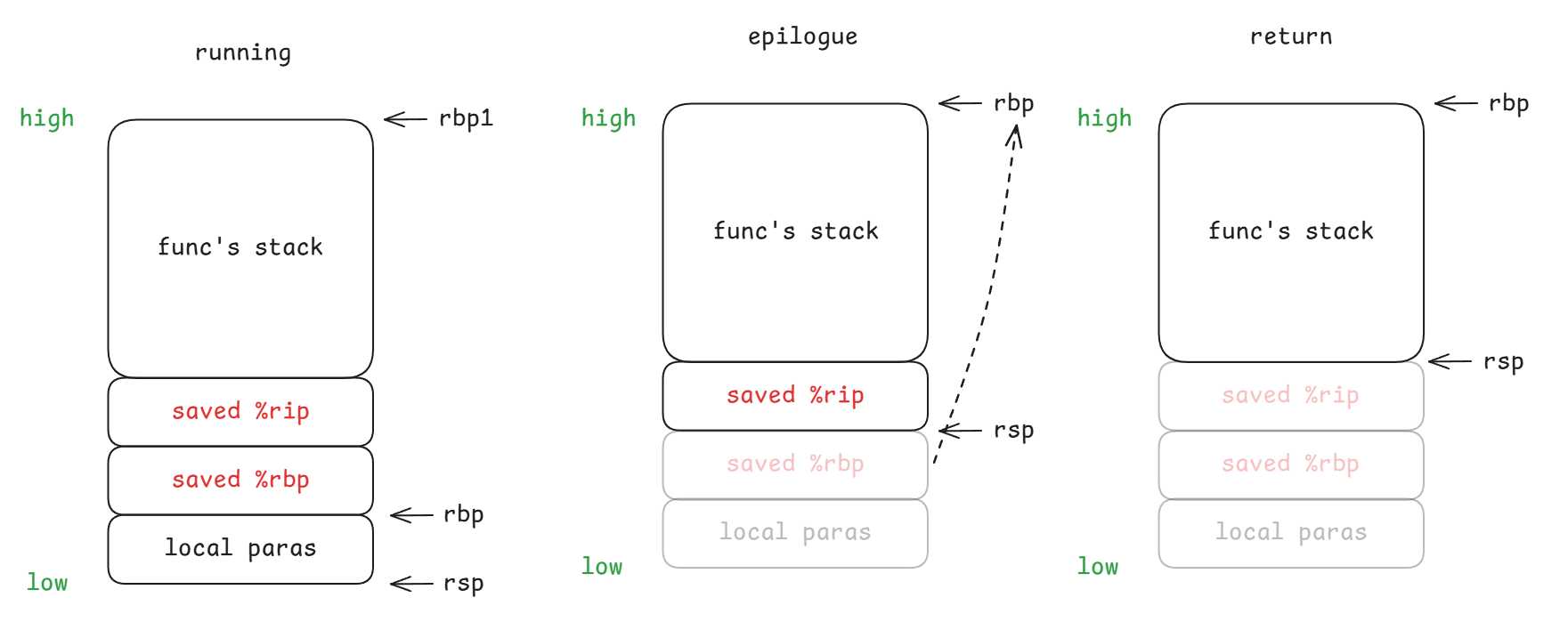 - epilogue: 将函数 B 栈 rbp 作为 rsp,恢复函数 A 栈 rbp