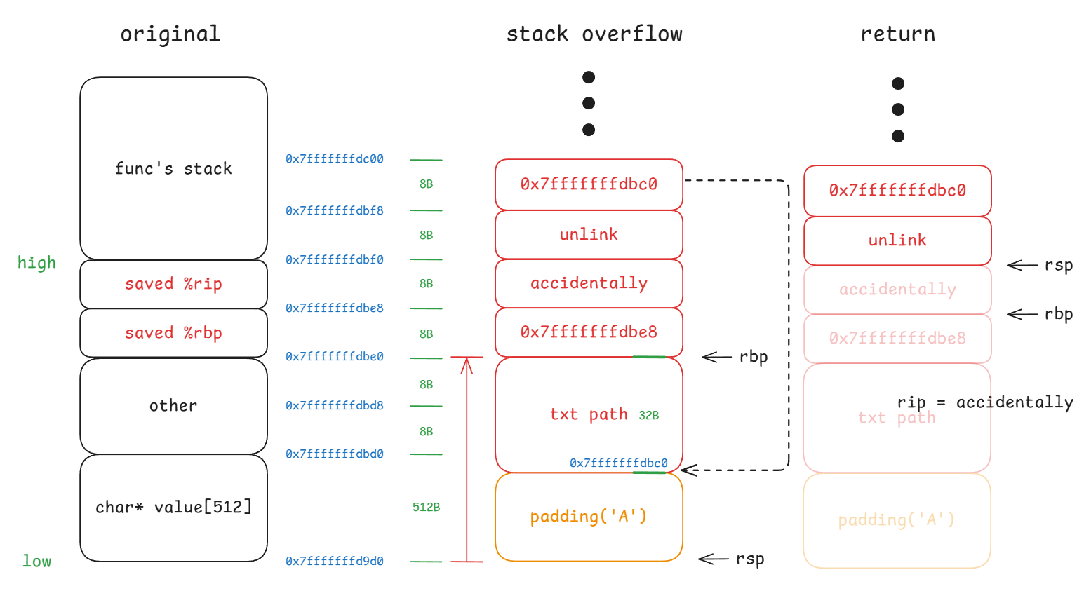 有了前面的背景知识,我们可以很容易理解栈上缓冲区溢出的攻击路径。具体来说,考虑一下如果我们向 buffer