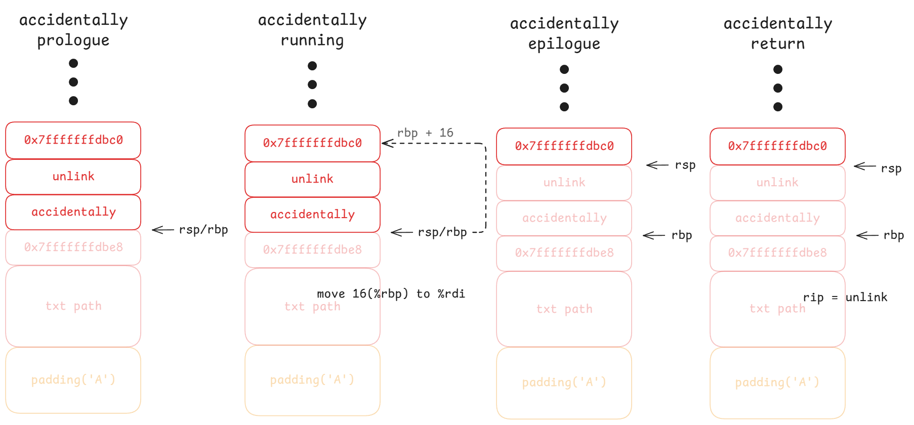 与经典的《Smashing the Stack for Fun and Profit》文章相比,有一个重要区别:函数参数不再通过栈传递,而是通过寄存器传递。这是现代 64 位架构的一个重要特点,会影响我们构造缓冲区溢出攻击的方式。